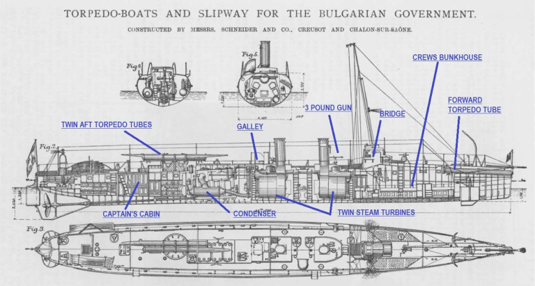 The entire Bulgarian Navy at the time consisted of one royal yacht–which had just run aground–and five small torpedo boats. These were new French-designed craft of less than 100 tons that had been built in Varna with French expertise, and launched in 1907-8. Forty metres long and just four wide, their steam engines generated nearly 2000 horsepower to give them 26 knots. They carried three 18-inch torpedos and two small three pounder guns, all manned by a crew of two dozen sailors.